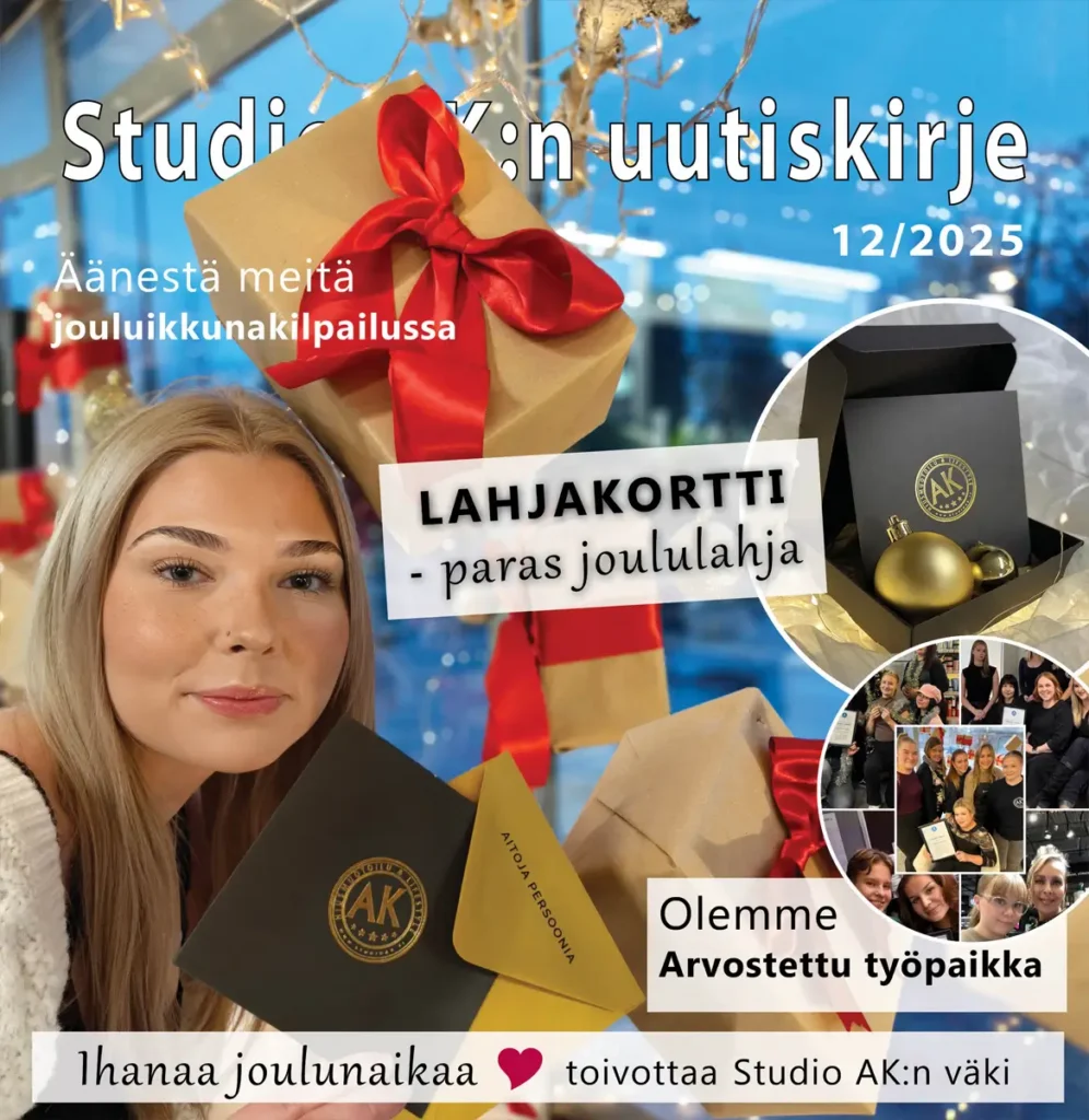 Joulukuu on käynnissä ja joulu lähestyy kovaa vauhtia! Studio AK:n lahjakortti on joulun paras lahja, joka sopii jokaiselle. Meiltä saatavana myös erilaisia lahjapakkauksia. Lisäksi olemme saaneet Arvostettu työpaikka -sertifikaatin sekä Seppälän ja Voionmaankadun liikkeistä on saatavana harjoittelijatöitä....