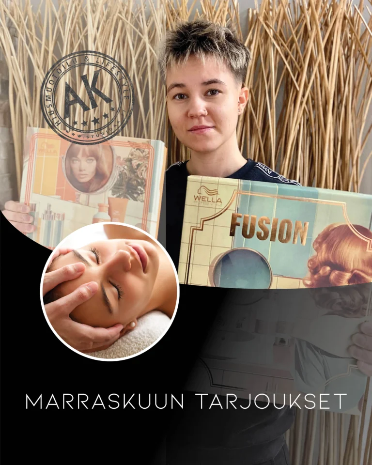 Joka tiistai Studio AK:ssa vietetään OPISKELIJATIISTAITA. Saat opiskelijakortilla kaikista normaalihintaisista palveluista ja tuotteista -15 %.