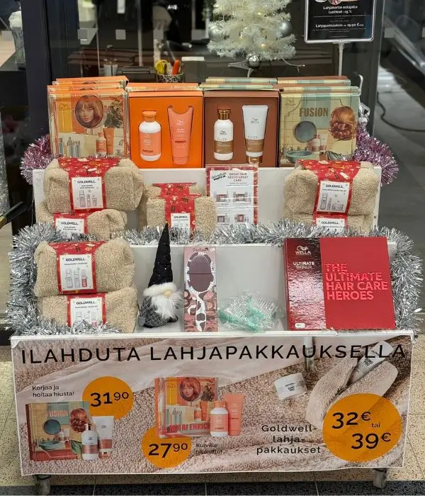 > Valikoimassa on lahjapakkaukset mm. seuraavilta brändeiltä: Wella, Kevin.Murphy, Goldwell, L’anza, Design.Me, Four Reasons ja Maria Nila.