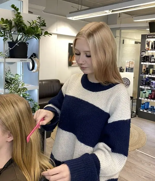 Voionmaankadulla harjoitteluaan tekevä Venla (toinen kuva) kertoo puolestaan itsestään näin: ”Oon kolmannen vuoden parturi-kampaajaopiskelija ja kiinnostunut värjäyksistä, raidoituksista sekä naisten ja miesten hiustenleikkuista. Näiden lisäksi olen tehnyt koulussa erilaisia hoitokäsittelyitä, parran ajoa, permanentteja, juhla- ja pikakampauksia, ripsien ja kulmien värjäystä sekä myynti- ja asiakaspalvelua.”