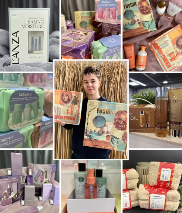 Valikoimassa on lahjapakkaukset mm. seuraavilta brändeiltä: Wella, Kevin.Murphy, Goldwell, L’anza, Design.Me, Four Reasons ja Maria Nila.